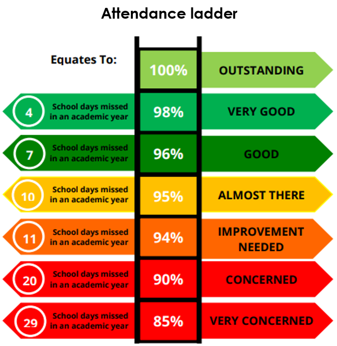 - Parents and carers will receive an attendance update at each parent consultation meeting (autumn and spring terms) as well as in their child's end of year report (summer term).